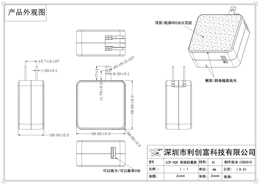 描述:USB30-85W折疊式充電器外殼 采用PC塑料材質做的,符合ROHS環保標準,性能好,耐高溫,尺寸:56*56*29.6mm ,廣泛應用于多種類型的充電器外殼。